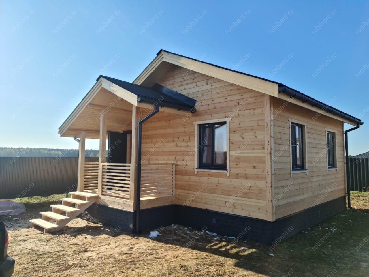 Визитной карточкой проекта стало стильное крыльцо с надежными ступенями и защитным козырьком, тщательно интегрированное в общий дизайн бани, подчеркивая качество исполнения и добавляя респектабельности фасаду.